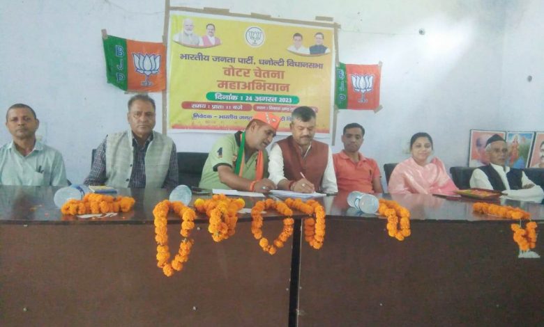 अभियान का शुभारम्भ करते हुए कार्य कर्ताओं में ऊर्जा का संचार करते हुए एक जुटता के साथ आखरी व्यक्ति को भाजपा की मुख्य धारा से जोड़ने का आह्वान किया। कार्यक्रम में प्रदेश महिला मोर्चा की महामंत्री व पूर्व ब्लाक प्रमुख गीता रावत ने कार्यकर्ताओं को संबोधित करते हुए कहा कि भाजपा की सोच हर वर्ग को साथ लेकर चलने का सदैव रहा है। उन्होंने कहा कि संगठन के हर कार्यकर्ता को मोदी व धामी की उपलब्धियों को देश के आखरी व्यक्ति तक पहुंचाने का काम करना होगा। उन्होंने कहा कि मोदी के नेतृत्व में देश आज विश्व गुरु की ओर अग्रसर है, जिसका हर देश वासियों को फक्र होना चाहिए। उन्होंने कहा कि भाजपा कार्यकर्ताओं का एक गुलदस्ता है, किसी भी कार्यकर्ता का दर्जा छोटा नहीं है बल्कि एक माला में पिरोकर संगठन को ओर मजबूत करना है, इस मौके पर वोटर चेतना अभियान के सयोजक बीरेंद्र राणा, मंडल अध्यक्ष पृथ्वी सिंह रावत, अनुसूचित मोर्चा के जिलाध्यक्ष राजेंद्र कोहली, नारायण सिंह राणा , पूर्व ब्लाक प्रमुख कुवर सिंह पंवार, नैनबाग मंडल के करण कंडारी, थौलधार के अध्यक्ष रामचंद्र खंडूरी , निहाल सिंह रावत ने भी कार्यक्रम को संबोधित करते हुए कार्यकर्ताओं में जोश का संचार किया। कार्यक्रम में मंडल महामंत्री सुनील थपलियाल, जयपाल कैरवान, आशुतोष कोठारी, खेमराज पुजारी, जनक बिष्ट, जयप्रकाश नौटियाल, चन्द्र सिंह रावत, महिला मोर्चा अध्यक्ष पूनम बंकवान, खेमराज भ्ट्ट, हीरामनी गौड़, चन्द्र प्रकाश चमोली, राजेश सजवान, श्याम सिंह, अब्बल सिंह, धुरत मनी नौटियाल, गुरु प्रसाद लेखवार सहित बड़ी तादात में कार्यकर्ता मौजूद रहे।